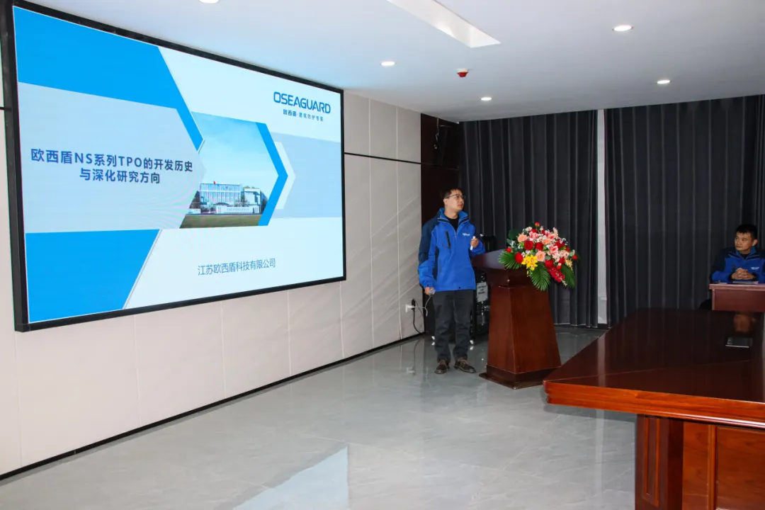 歐西盾防水總工程師顧金佳向大家介紹了《歐西盾NS系列TPO 的開發(fā)歷史與深化研究方向》,闡述了TPO防水卷材的發(fā)展史、歐西NS06應用歷程、NS應用研究方向探討,并就應用研究基地的合作內容與方向和與會的領導們展開了討論。
